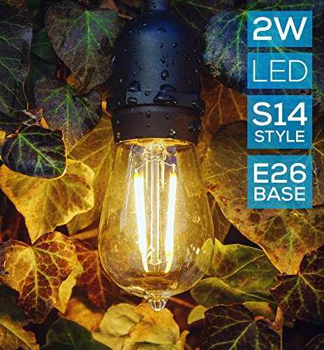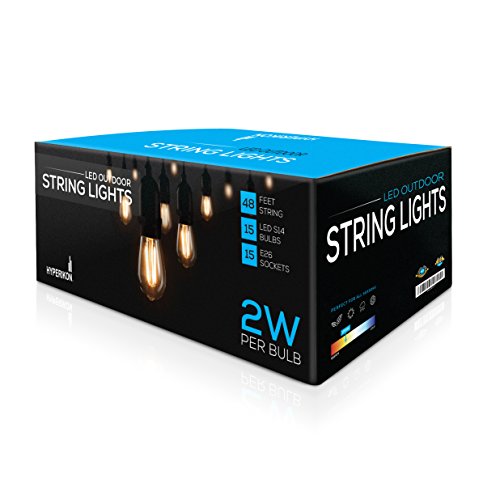 Hyperikon LED Outdoor Commercial String Lights, 48ft with 15 Hanging Sockets, 2W LED S14 LED Bulbs included - Weatherproof Vintage Edison String Lights for Patio, Backyard, Party Wedding decoration