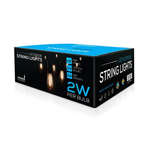 Hyperikon LED Outdoor Commercial String Lights, 48ft with 24 Hanging Sockets, 2W LED S14 LED Bulbs included - Weatherproof Vintage Edison String Lights for Patio, Backyard, Party Wedding decoration