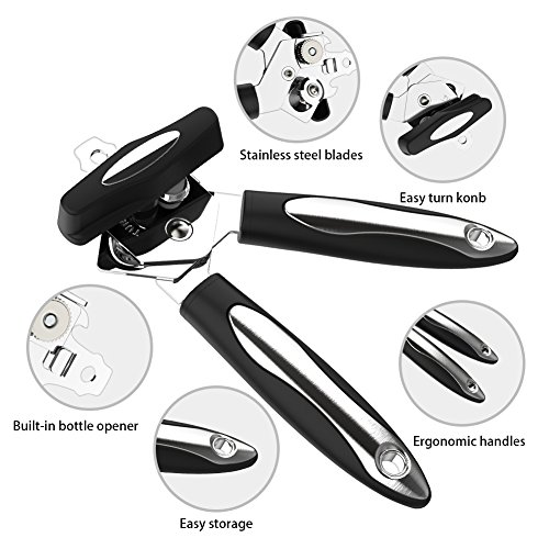 Hicober Manual Can Opener, Professional Portable Heavy Duty Stainless Steel Sharp Blade and Gear -- Built in Bottle Opener with Easy Turn Knob and Ergonomic Soft Grips Handles