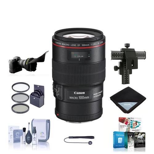 Canon EF 100mm f/2.8L IS USM Macro AF Lens Kit - USA - with 67mm Photo Filter Kit, Lens Cap Leash, Cleaning Kit, Four Way Focusing Rail Fine Control, Flex Lens Shade, Software Package