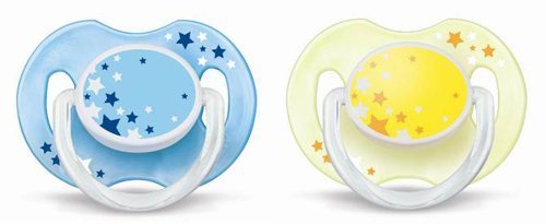 -. Binding : Baby Product -. Feature : Orthodontic symmetrical collapsible nipple so right side up or upside down, philips avent pacifiers help ensure natural development of teeth and gums / Taste and odor-free silicone nipple makes for an easy transition between pacifier, breast and bottle / Includes two pacifiers, ideal age range: 0-6 months / WARNING: Do not tie pacifier around child's neck as it presents a strangulation danger / Colors and designs may vary, you will receive one of the following: night or yellow. -. Label : Philips AVENT -. Manufacturer : Philips AVENT -. ProductGroup : Baby Product -. ProductTypeName : BABY_PRODUCT -. Publisher : Philips AVENT -. Studio : Philips AVENT -. Title : Philips AVENT SCF176/18 Glow in the Dark Night-Time Soother - 0-6 Months - Colors May Vary (Pack of 2) by Philips AVENT