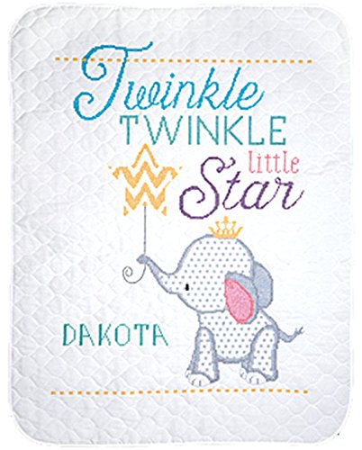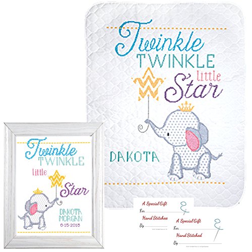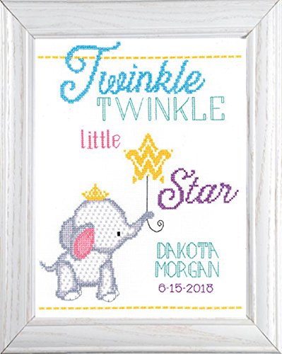 2 Twinkle Twinkle Little Star Janlynn cross stitch kits: Twinkle Twinkle Little Star Quilt (182-0411) and Twinkle Twinkle Little Star Birth Announcement (182-0412); both cross stitch kits for baby feature a beautiful but simple design - an adorable elephant holding a floating star-balloon and have the saying “Twinkle Twinkle Little Star”; birth announcement is a quick-to-stitch COUNTED cross stitch design; baby quilt is a STAMPED EMBROIDERY cross stitch design