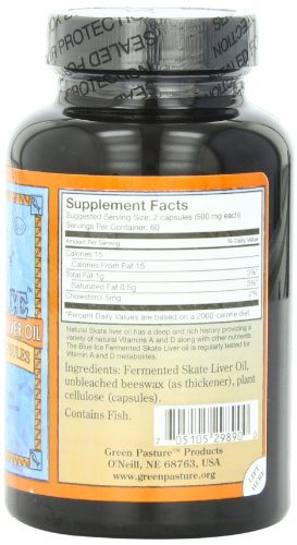 -. Binding : Health and Beauty -. Brand : Green Pasture -. IsAdultProduct : 0 -. Label : Green Pasture -. Manufacturer : Green Pasture -. MPN : NA -. PackageQuantity : 1 -. PartNumber : NA -. ProductGroup : Health and Beauty -. ProductTypeName : HEALTH_PERSONAL_CARE -. Publisher : Green Pasture -. Studio : Green Pasture -. Title : Blue Ice Fermented Skate Liver Oil 120 Caps