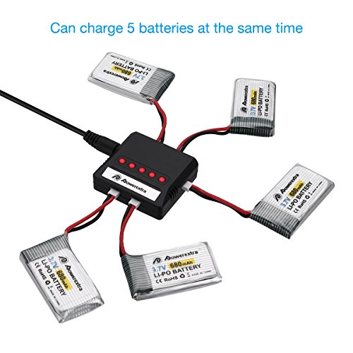 Studio : Powerextra Publisher : Powerextra Binding : Toy Product Description 5Pcs 3.7V 680mAh Lipo Batteries for Syma X5, X5C, X5SC, X5C-1,X5SW and Cheerson CX-30W RC Quadcopters. Battery Features: ? Capacity:680mAh ? Voltage: 3.7V ? Single Battery Weight: 0.68oz ? Single Battery Size:0.31*0.98*1.65inch Retail package includes: ? 5x3.7V 680mAh LiPO rechargeable battery replacement for Syma X5C,X5SW, no modification needed! ?1x 5-Port Charger Compatible with these models: Syma X5, X5C, X5SC, X5C-1,X5SW and Cheerson CX-30W 5-Port Intelligent Charger for 3.7V Lithium RC Batteries. ?Charge 5 Pack at one time. ? Overcharge protection ? Short-circuit protection ? Light weight and super easy to use Charger Specifications: ? Input: DC 5V ? Output: DC 4.2V ? Size: 1.65 x 1.5 x 0.51inch ? Weight: 0.45oz (not including wires and package) ? Compatible with most Molex Plug RC Helicopter Airplane 1S Batteries: LED Status: ? Red Lights on: currently charging ? Red Lights off: charging complete CAUTION: 1)Please make sure that the size of the battery is suitable for your drone before purchasing! 2) On receving, please double check whether battery swelled up.If swelled up, do stop using or charging, and contact us in time. 3) Do not overcharge or over-discharge the batteries. 4) Do not charge batteries that are still hot or it might lead to fire or explosion. A fireproof safety bag is recommended for lipo battery storage/charge. 0