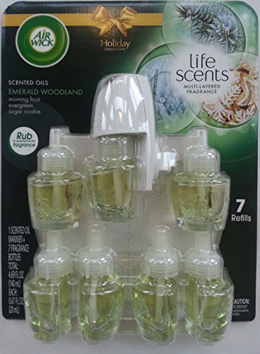 Air Wick Life Scents Scented Oils Emerald Woodland, Morning Frost, Evergreen, and Sugar Cookie, 7 Refills Plus Bonus Warmer