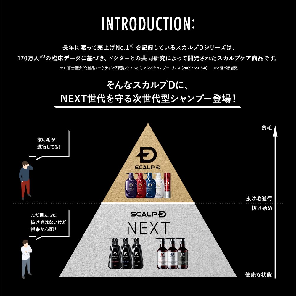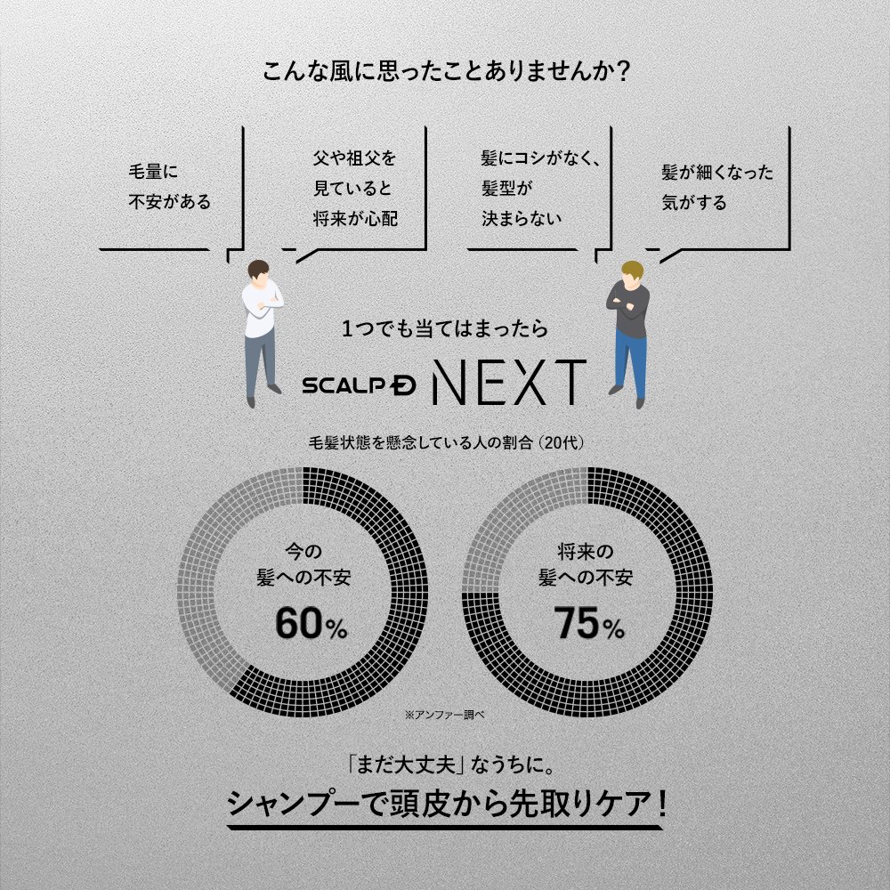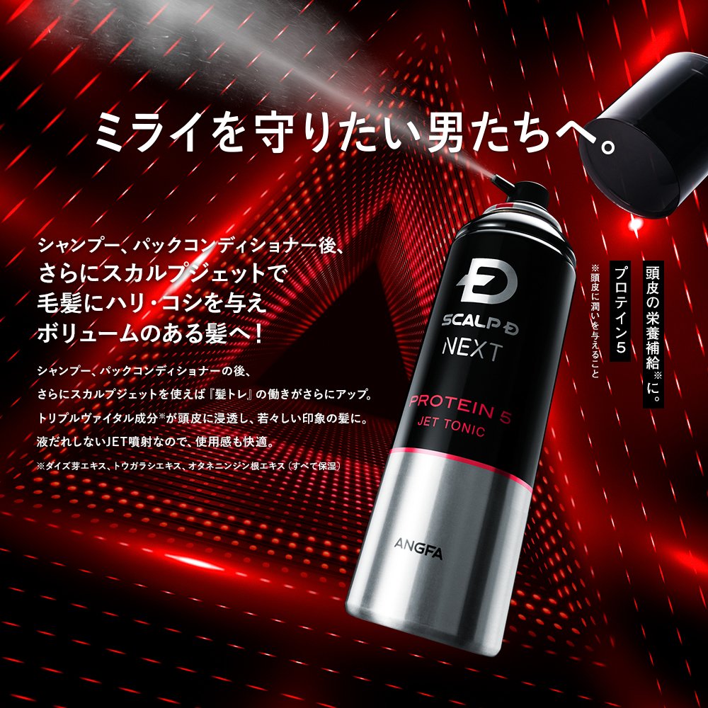スカルプD NEXTは、20代~30代の生活習慣に着目し生まれました。 シャンプーの後、スカルプジェットを使用することで『髪トレ』の働きがさらにアップします。 エイジングケア成分ファイトポリアミンが頭皮に浸透し、若々しい印象の髪に。液だれしないJET噴射なので、使用感も快適です。
