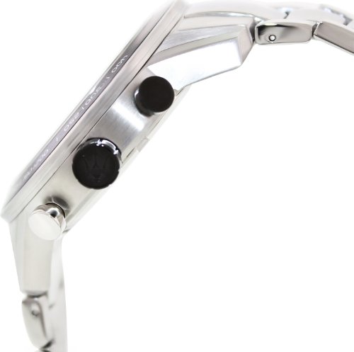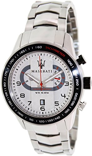 Show off your laid-back personality with this casual Maserati timepiece This no-nonsense watch features a 46 mm silver stainless-steel case and silver stainless-steel band This watch also sports a bold silver dial and black details allowing the watch to function as both a fashionable accessory and a valuable timekeeping tool Additional features include a chronograph tachymeter luminous screw-down crown date display water resistant to 100 meters Arabic numeral display and measures secondsFeature