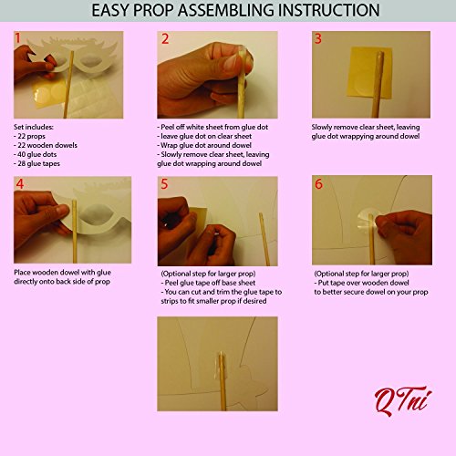 QUALITY: 21 pieces made of rare high quality 400 gsm / 270 lbs glossy cover cardstock paper and printed to last. Included with the 22 props are 40 glue dots, 28 glue tapes, and 22 1/8" wooden dowels