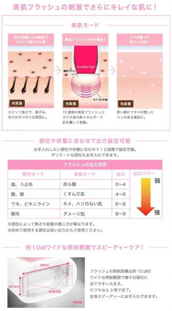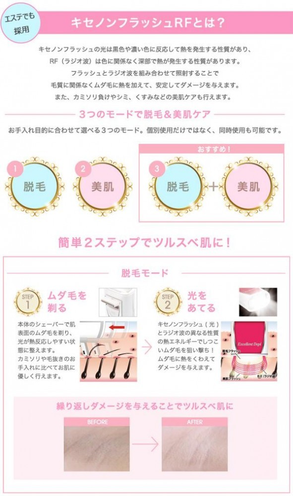 | 本体のシェーバーで肌表面のムダ毛を剃り、キセノンフラッシュとラジオ波の熱エネルギーでしつこいムダ毛を狙い撃ち!!同時にお肌のキメも整えます。 |