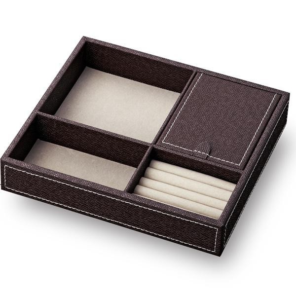 小物入れの数が多いので、指輪等アクセサリーからスマートフォンまで様々な物を収納する事ができる、フェイクレザーのトレーです。