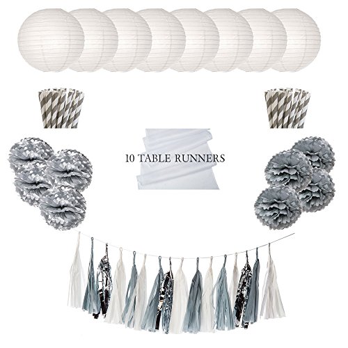 Luna Bazaar Silver Lining Party Decoration Kit - Includes Garland, Table Runners, Paper Straws and Paper Pompoms