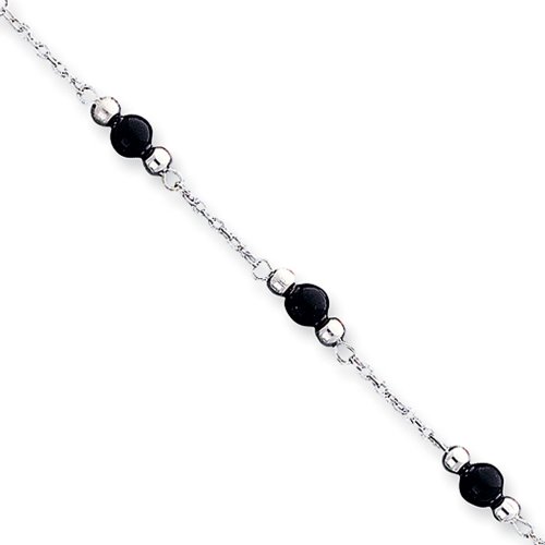 Polished 6mm spheres of black onyx punctuated by gleaming silver balls on this stunning 9-inch ankle bracelet will subtly enhance your look with its sleek and bold style. Created from tarnish resistant rhodium-plated sterling silver and fastens to your ankle with a secure, spring ring clasp.Feature