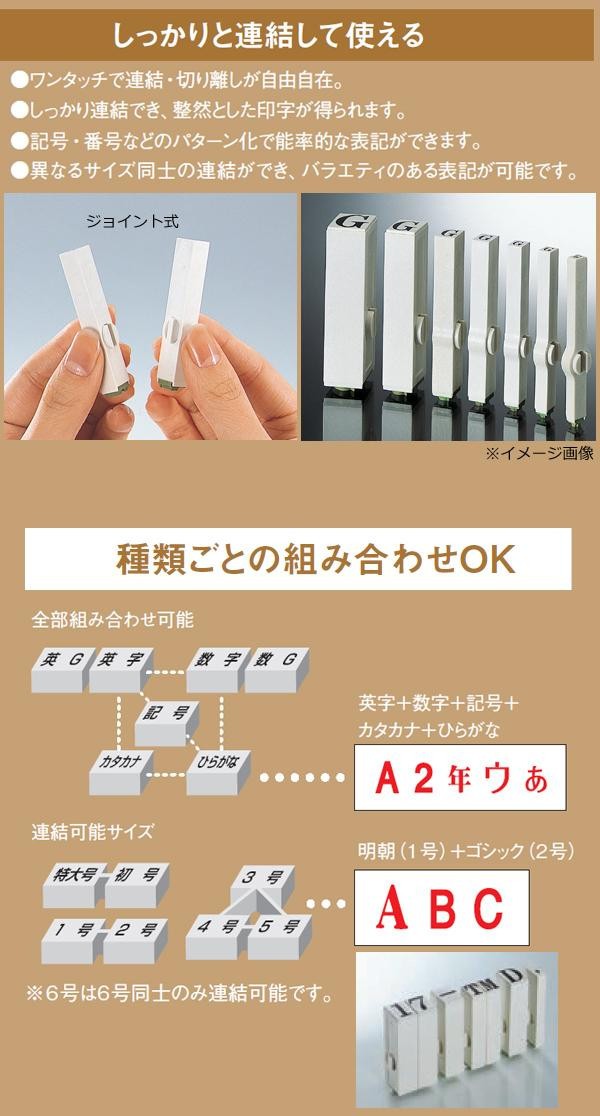 軽く押さえるだけで連結でき、引っ張るだけで簡単に切り離せるジョイント式スタンプです。異なるサイズでも連結ができ、多様な表記が可能。整理しやすい便利なケース入り。 |
