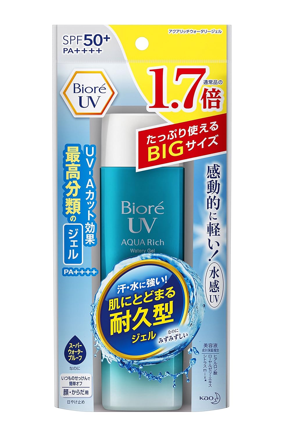SPF50+ / PA++++ 内容量:155ml スキンタイプ:全肌質対応 全成分:水、エタノール、メトキシケイヒ酸エチルヘキシル、(メタクリル酸ラウリル/メタクリル酸Na)クロスポリマー、酸化チタン、安息香酸アルキル(C12-15)、ビスエチルヘキシルオキシフェノールメトキシフェニルトリアジン、ジエチルアミノヒドロキシベンゾイル安息香酸ヘキシル、ジメチコン、エチルヘキシルトリアゾン、キシリトール、パルミチン酸デキストリン、含水シリカ、ヒドロキシエチルセルロース、ステアリン酸グリセリル、(ビニルジメチコン/メチコンシルセスキオキサン)クロスポリマー、トリエトキシカプリリルシラン、(アクリレーツ/アクリル酸アルキル(C10-30))クロスポリマー、セタノール、パーフルオロアルキル(C4-14)エトキシジメチコン、水酸化Al、水酸化K、ステアリルアルコール、ステアリン酸、カンテン、ポリビニルアルコール、イソセテス-20、ステアロイルメチルタウリンNa、AMP、ステアロキシPGヒドロキシエチルセルローススルホン酸Na、グルタミン酸、ローカストビーンガム、マルトース、BG、PG、ヒアルロン酸Na、ローヤルゼリーエキス、オレンジ果実エキス、グレープフルーツ果実エキス、レモン果実エキス、フェノキシエタノール、EDTA-2Na、BHT、香料