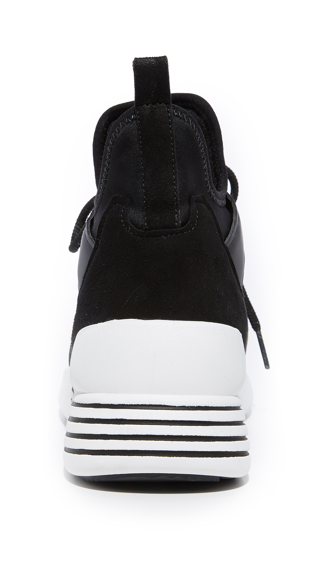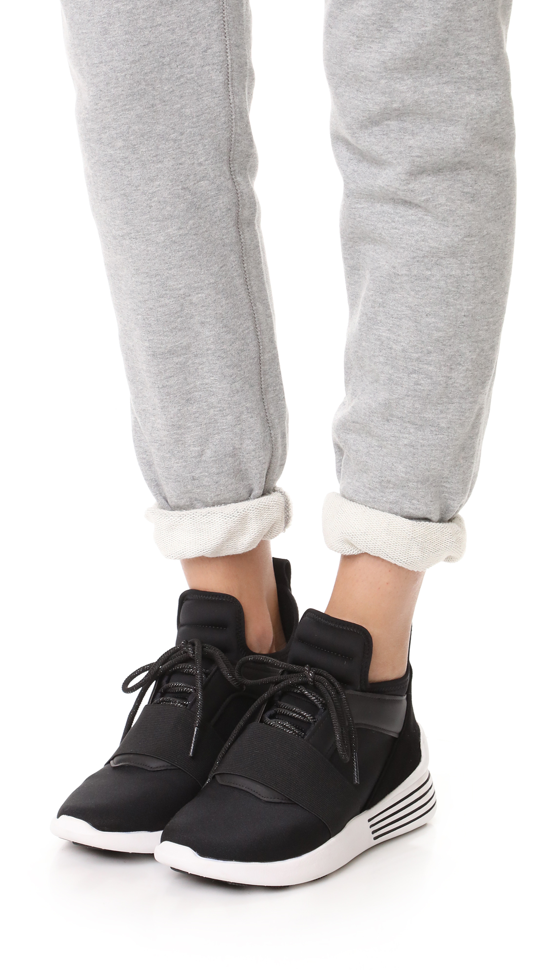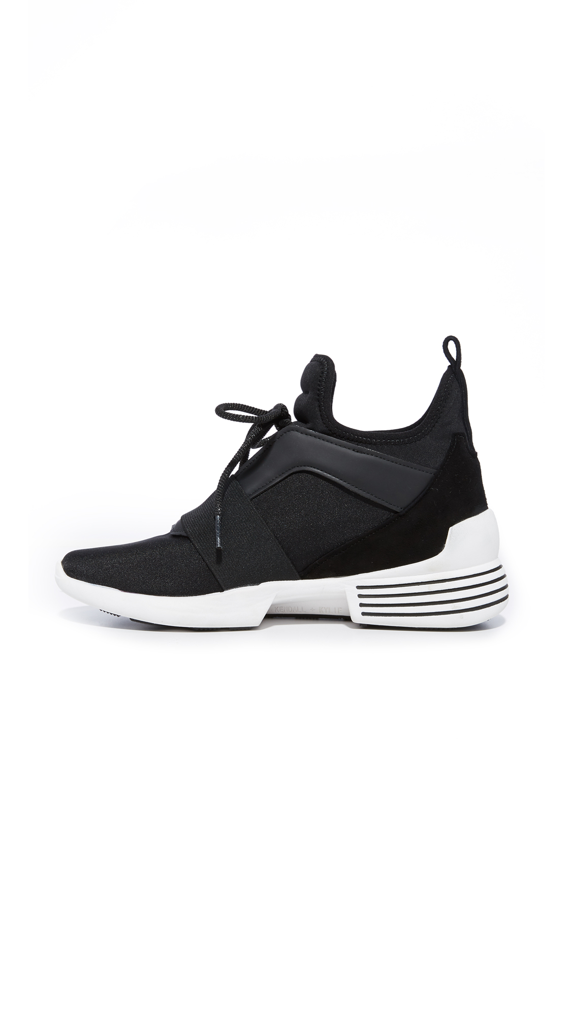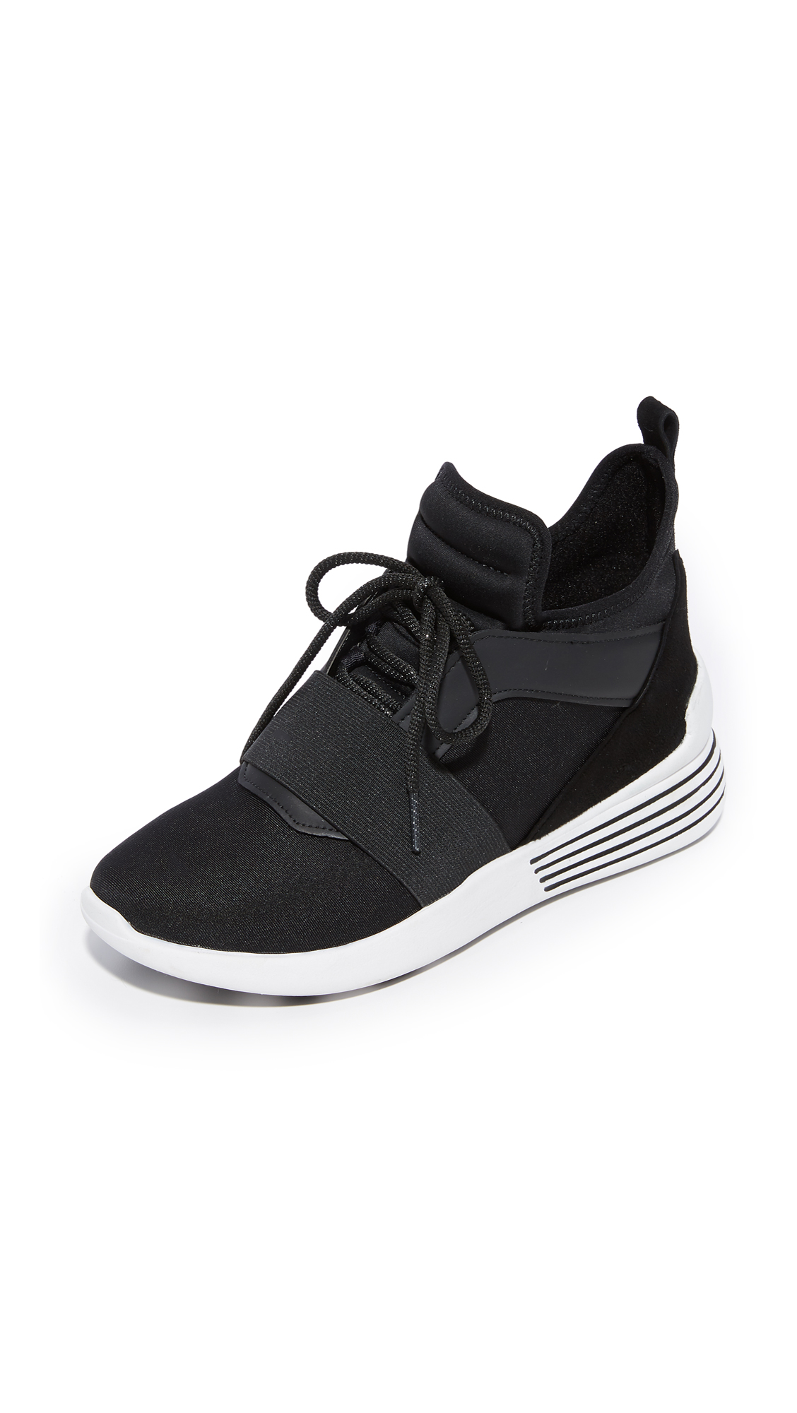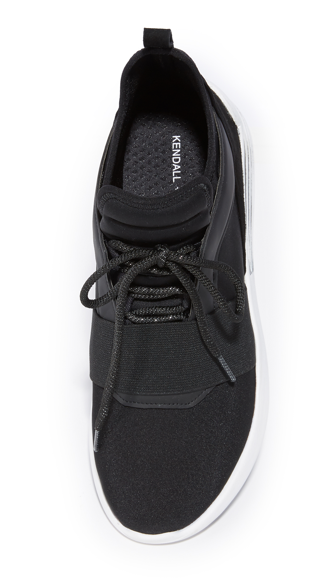 Sporty KENDALL KYLIE sneakers in an eclectic mix of neoprene and mesh. Padding and a pull tab trim the neoprene sock. An elastic strap covers the lace-up closure. Cutout foam platform and rubber sole.