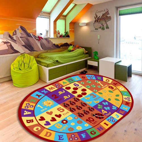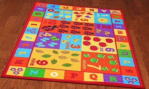 Letter and numbers rug anti slip backing for safety of kids non-skid rubber bottom, machine washable, power loomed construction with nylon bacteria resistant surface is perfect for homes with kids and pets.