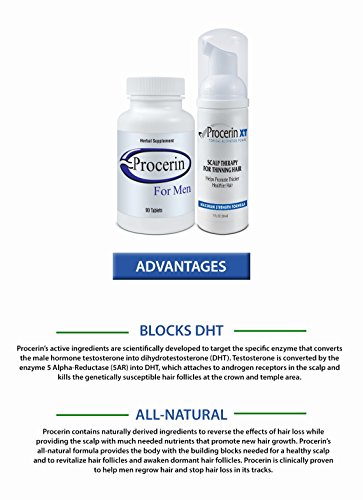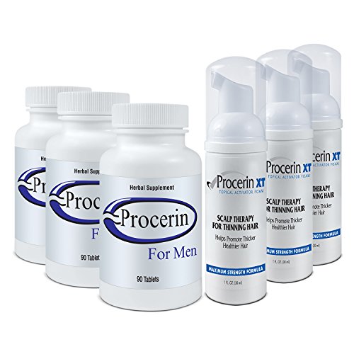 -. Binding : Health and Beauty -. Brand : Procerin -. EAN : 0094922973450 -. Feature : Procerin is the only hair regrowth supplement to offer you a risk-free 90-Day Money Back Guarantee! / Performance: Procerin blocks DHT without reacting with testosterone (as some prescription medications do). This reduces, and can even halt, the further loss of hair from the scalp, without causing the sexual side effects of prescription drugs like finasteride (Propecia). / Results: Procerin's benefits are greatest for younger men (18-35), and those whose hair is still in a growth phase. / Available in a convenient tablet form and topical solution for daily use. / Safe: Procerin is an all-natural supplement available without a prescription. -. Label : Procerin for Men -. Manufacturer : Procerin for Men -. MPN : B000F4BSA2 -. PackageQuantity : 1 -. PartNumber : B000F4BSA2 -. ProductGroup : Beauty -. ProductTypeName : HEALTH_PERSONAL_CARE -. Publisher : Procerin for Men -. Studio : Procerin for Men -. Title : Procerin Combo Pack - 3 Month Supply -. UPC : 094922973450