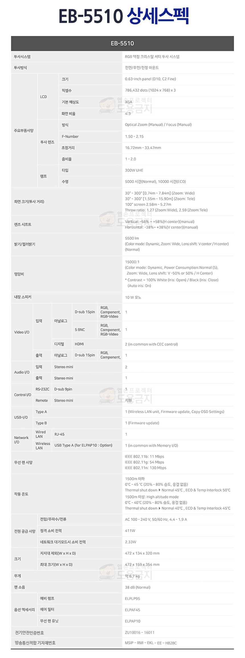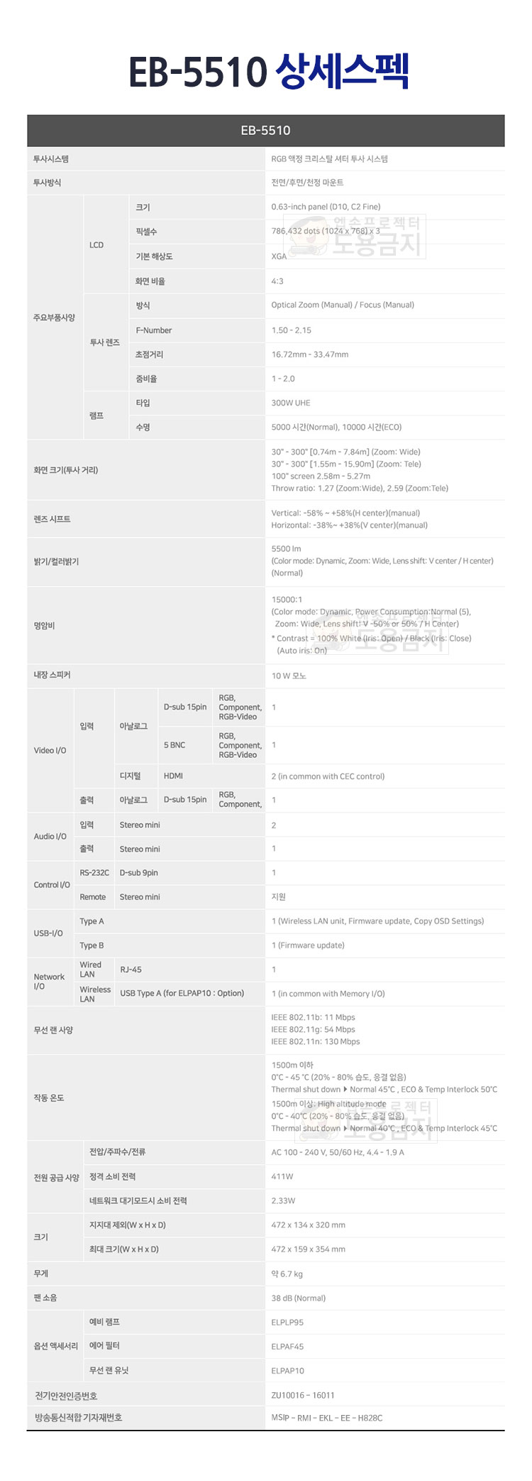 | 5500안시,XGA해상도,1024X768 해상도,명암비15000:1,무게6.7kg,소음38dB,LCD방식,렌즈쉬프트,렌즈시프트,왜곡현상보정 |