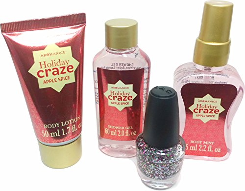 Studio : Aromanice Publisher : Aromanice Binding : Health and Beauty Product Description Holiday Craze Scented Gift Set. This scented gift set is perfect for the holiday season. Whether for yourself or as a gift, its sure to put a smile on any face. Includes: 1 - 2.2 fl. oz Body Mist, 1 - 2 fl oz Shower Gel, 1 - 1.7 fl. oz Body Lotion and 1 .44 fl. oz Sparkle Nail Polish. 0