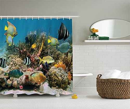 Ambesonne Ocean Decor Collection, Colorful Underwater Coral Colony on a Reef with Beautiful Shoal of Tropical Fish Caribbean Sea Print, Polyester Fabric Bathroom Shower Curtain, Orange Teal Yellow
