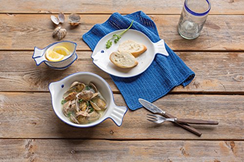 Enjoy seafood in hand painted porcelain dishes designed just for it! this deep-walled fish shaped bowl is neutral in color, allowing the meal to stand out as catch of the day. Blue trim continues the nautical theme. The bowl measures 7.5 Inches long, 6.5 Inches wide and 3.5 Inches tall. Set of two matching bowls.Feature
