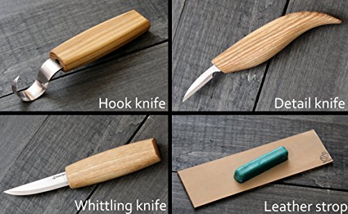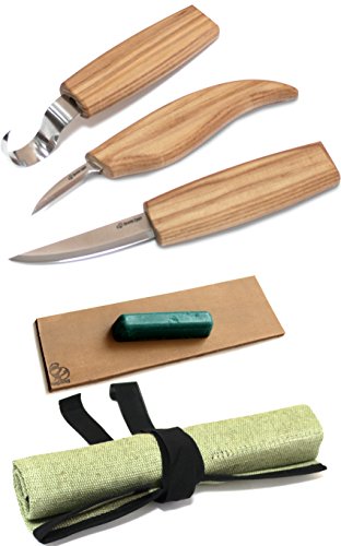 BeaverCraft, Wood Carving Tools Set for Spoon carving 3 Knives in Tools Roll Leather Strop and Polishing Compound Hook Sloyd Detail Knife