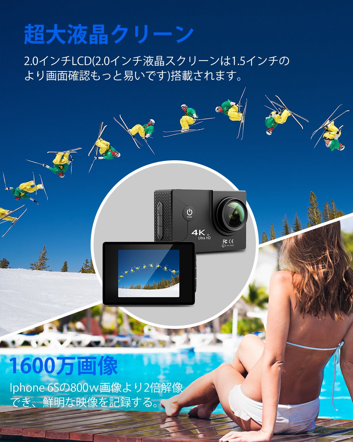 Excellent in water resistance, underwater photography such as diving and swimming is also possible.