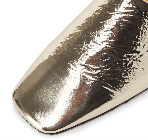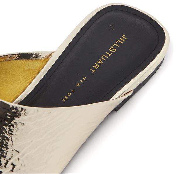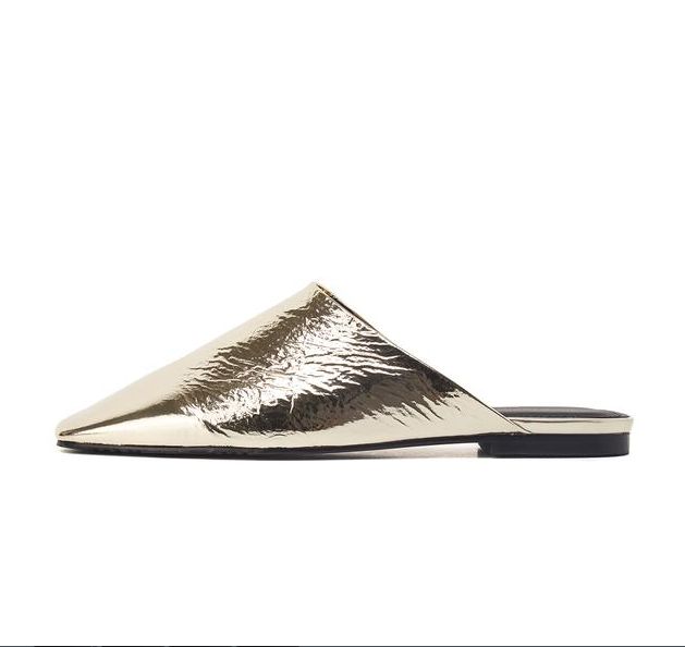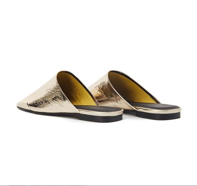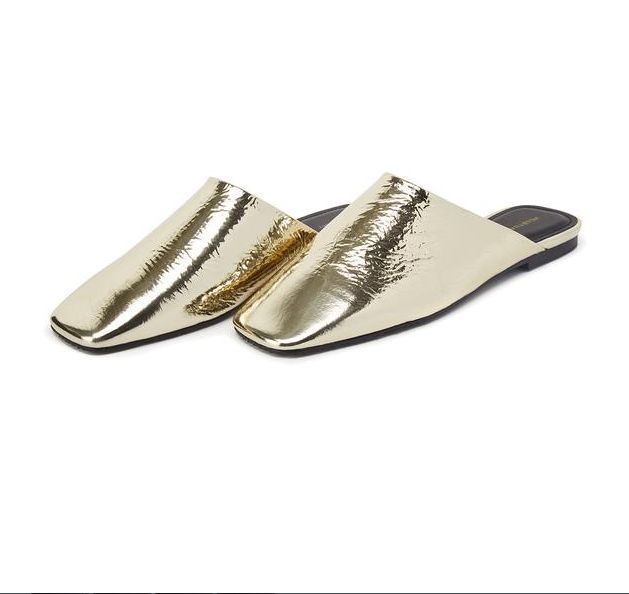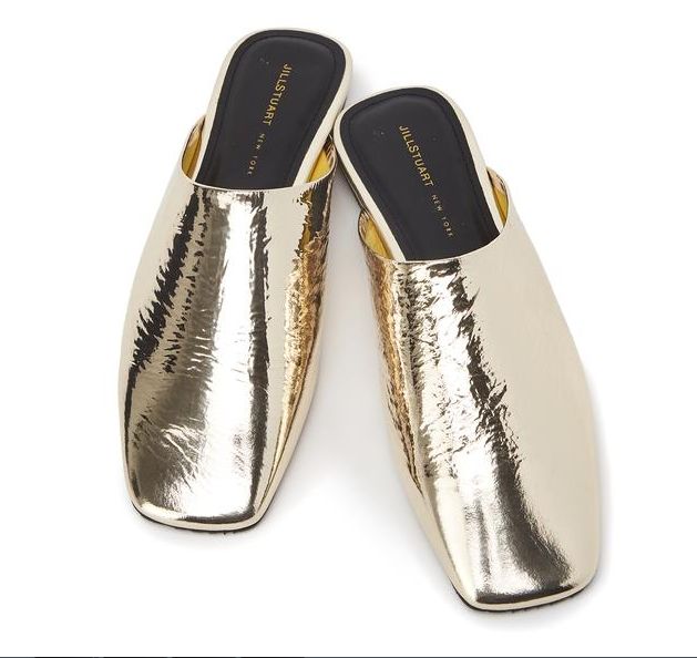 스퀘어 토 디자인으로 메탈릭한 골드 컬러감이 돋보이며 구김이 더해진 텍스쳐로 멋스럽게 착화가 가능한 뮬입니다.