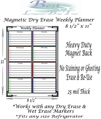 -. Binding : Office Product -. Brand : Best Lage Bag Tags -. Color : Clear, Black, White, Multi-Color -. EAN : 0705911432987 -. Feature : Heavy Duty Dry Erase & Wet Erase Premium Over Laminate - Erase and Re-Use / Magnetic back is Durable & Long Lasting / 8 1/2" x 11" - 25 mils thick / Works with any Dry Erase & Wet Erase Markers & Erases Easily with no Staining or Ghosting / Fits any size Refrigerator -. Label : Best Lage Bag Tags -. Manufacturer : Best Lage Bag Tags -. MPN : WP811 -. PackageQuantity : 1 -. PartNumber : WP811 -. ProductGroup : Office Product -. ProductTypeName : OFFICE_PRODUCTS -. Publisher : Best Lage Bag Tags -. Size : 8.5" x 11" -. Studio : Best Lage Bag Tags -. Title : Magnetic Dry Erase & Wet Erase Weekly Planner / Notepad - 8 1/2" x 11" - Refrigerator Dry Erase Board -. UPC : 705911432987