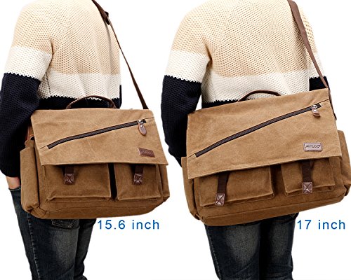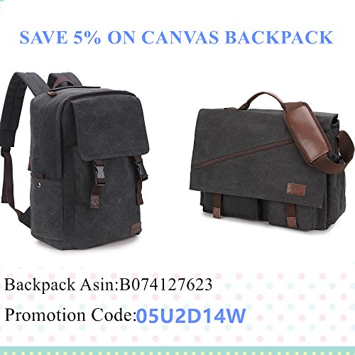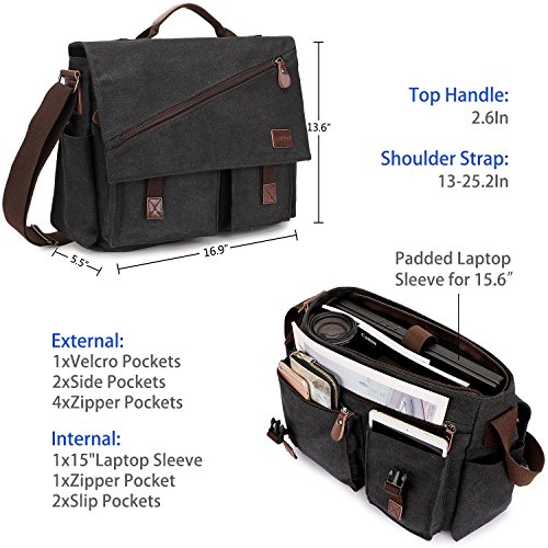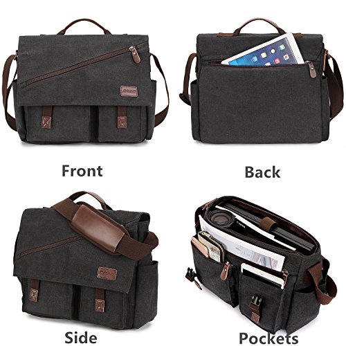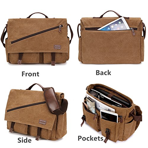 Product Description The messenger bag is made of heavy duty and water resistant canvas which provides more protection for your laptop and books.With the well-thought structure and adjustable shoulder strap and top handle ,it can be carried by the handle as briefcase , worn on shoulders, and across body.It is perfect for men and women who need take laptop and many things to college, high school or work. Structure: