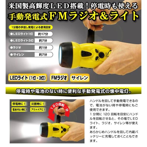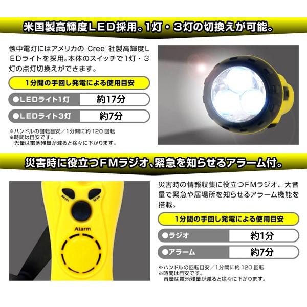 ハンドルを回転させて充電すると、LEDライト、ラジオ、サイレン等が使えます。