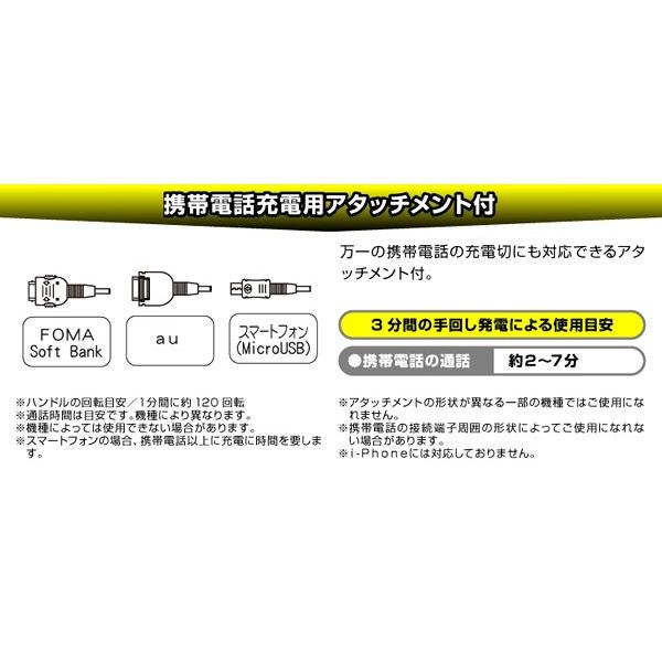 携帯電話充電用アタッチメント付きで、FOMA・SoftBank、au、スマートフォンが充電可能です。
