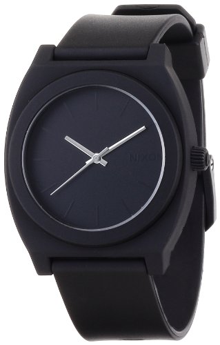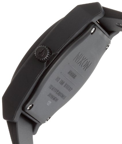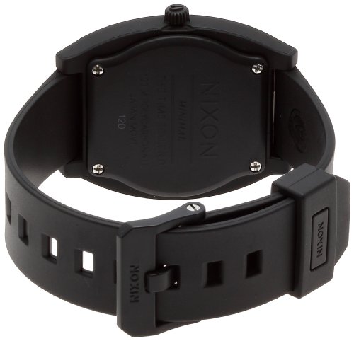 The Nixon men's quartz watch has a contemporary design and practical features making it the perfect choice. The gorgeous black polyurethane strap contrasts elegantly with the grey hands. This timepiece has a buckle clasp and mineral crystal for durability. Case: Plastic Caseback: Screw-down Dial: Black Hands: Grey luminescent Markers: Black applied indices Strap/bracelet: Black polyurethane Clasp: Buckle Crystal: Mineral Crown: Push/pull Movement: Quartz Water resistance: 10 ATM/100 meters/330 feet Case measurements: 35 mm wide x 11 mm thick Bracelet measurements: 20 mm wide x 8.5 inches long Model: A119524-00 All measurements are approximate and may vary slightly from the listed dimensions. Men's watch bands can be sized to fit 7.5-inch to 8.5-inch wrists.. A screw-down crown (knob) creates a water-resistant seal. To unscrew the crown, turn counter-clockwise and pull/push into position to set time, date, and other functions. To close the crown, press it against the case and turn clockwise.Feature