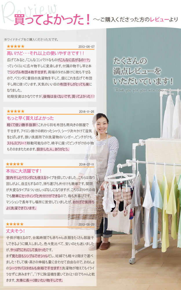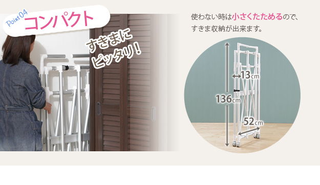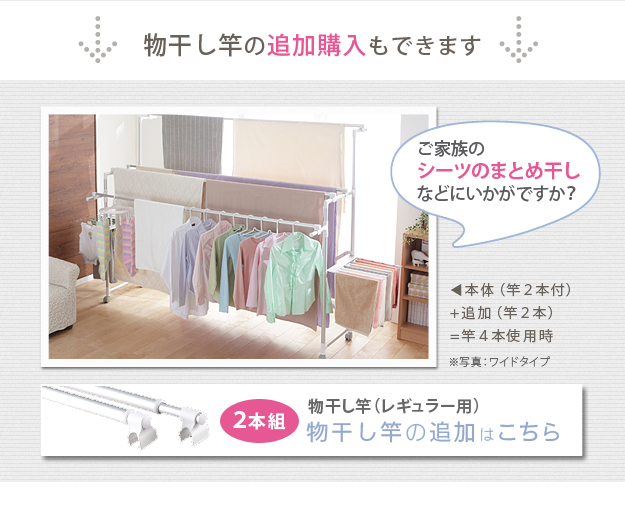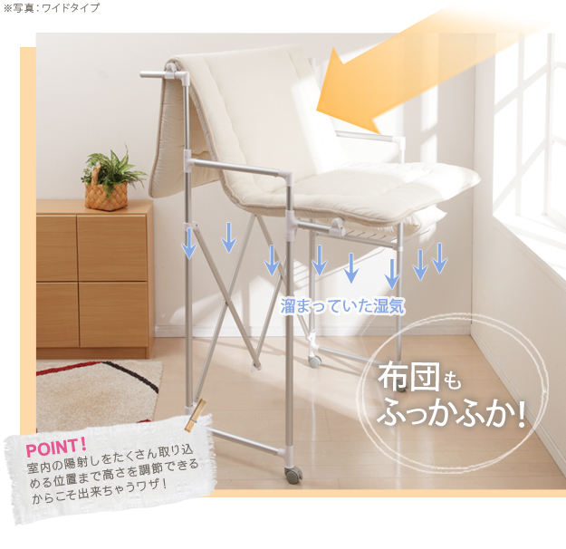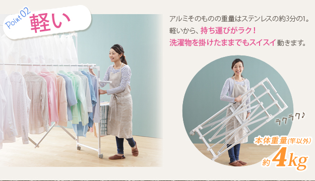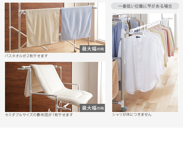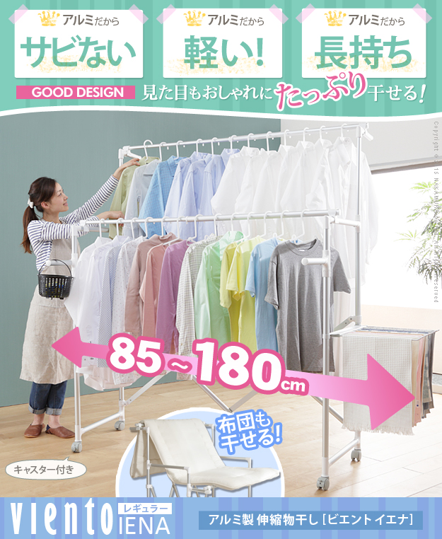 ●商品について:場所や洗濯物の量に合わせて幅も高さも伸縮自在!スペースを無駄なく活用できる室内用アルミ伸縮物干し(レギュラー)。最大サイズまで伸ばして使えば、大きな洗濯物までしっかり干せて花粉や梅雨の季節も安心☆丈夫でサビにくいアルミ製。軽いのでサイズ調整や収納もラクラク♪コンパクトにたためて収納場所をとりません。移動に便利なキャスター付き。サイド(片側)には便利なタオル掛けが付いています。