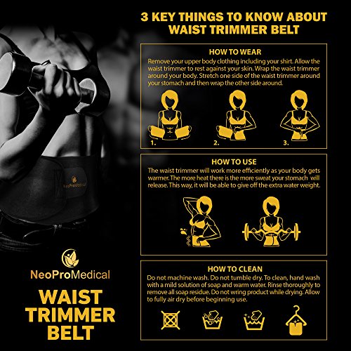 We tried all the others and discovered what is really important in an exercise belt: - Designed to work from the smallest waist and to stretch to a 46" waist - Wide enough to cover the stomach area and stay put during exercise - Rounded, double stitched edges for comfort and durability - Thick enough to produce the heat needed to get results and hold it's shape - Blend of quality Neoprene, Nylon & Polyester to form a firm bond with the velcro fastening - So comfortable that you hardly notice you are wearing it - Suitable for left or right handed for everyone to easily wrap, pat & go - Made to last and easy to wash and keep clean HOW TO WEAR NeoProMedical Waist Trimmer should only be worn during exercise for no more than 2-3 hrs at a time. Before you begin exercising, adjust your Waist Trimmer to desired position and wrap it comfortably around your abdomen. The Waist Trimmer can be worn under or over your clothing. HOW TO WASH Before Initial use: Wipe down a Waist Trimmer with a damp cloth. Use a clean cloth to dry off Waist Trimmer or air-dry overnight. After Exercise: Lather a damp cloth with soap and run down inside of Waist Trimmer several times. Then, rinse the cloth and wipe down again until there are soapy streaks left. Use a clean cloth to dry or air-dry overnight. ALLERGY NOTICE Some individuals may be sensitive to Neoprene or Neoprene blend rubber. If a rash develops discontinue use. Before starting any exercise routine please consult a physician. Always stay monitor your body why exercising and remember to stay hydrated When you put on the NeoProMedical Tummy Trimmer you will instantly feel a difference in posture and support. This effect will last throughout your entire workout, providing the best quality heat to burn fat, move cellulite and expel toxins. We know because we've tried it!Feature