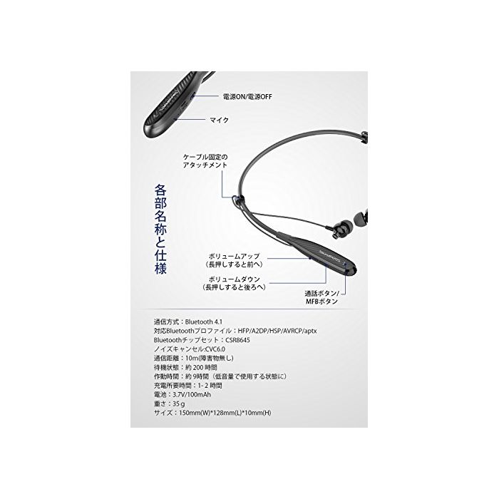 【안심인 메이커1년간 보증 팩키지 내용】만일 상품에 불편이 있는 경우는,폐사에 연락 해 주시면 일본어 스탭이 신속하게 대응 하겠습니다.구입 후30일간은 원칙 반품 환불 대응 합니다.고객 사정 에서의 반품 환불도 가능합니다.또한구입 후12개월의 메이커 보증이 붙고 있고, 아마존의 구입 이력 보다 폐사로 연락 하십시오.【팩키지 내용】 ●Q1000블루 tooth 이어폰 본체 ●충전 케이블 ●S ,M ,L 3사이즈의 이어 피스(M사이즈는 출하시에 장착필) ●취급 설명서&보증서※PDF의 일본어판 취급 설명서도 준비 하고 있기 때문에,필요한 경우는 아마존 에서의 주문 번호를 기입하신 후,아마존의 구입 이력 보다 폐사로 연락 하십시오.