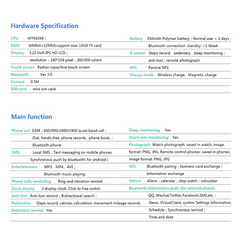 Important Features: ★SIM card & Memory card supported: When you insert the SIM card (GSM/GPRS 850/900/1800/1900MHz) into the smart watch, it can be used as a phone.