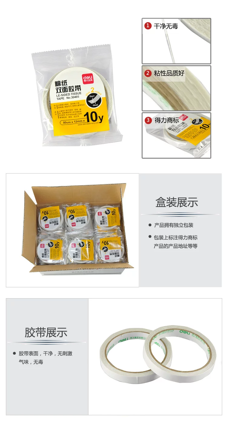 Name: hot melt double-sided tissue tapeQuantity: 10 small volume price ohSize: Width * Length = 12mm * 10y (1y = 0.91 m)Thickness: 80umFeatures: individually wrapped, non-toxic, non-irritating odor, viscous