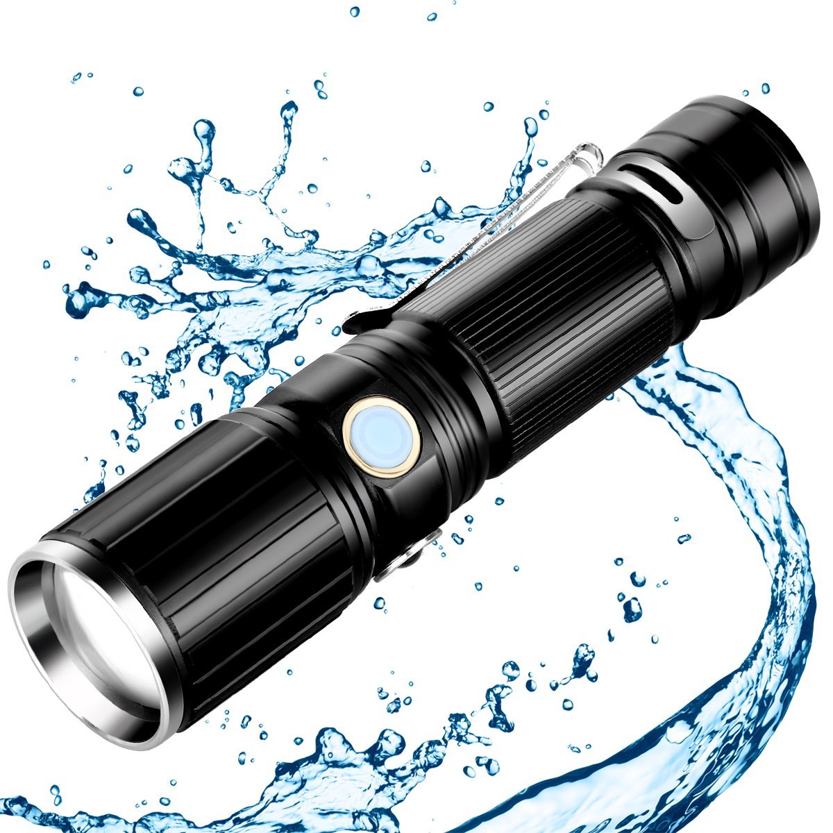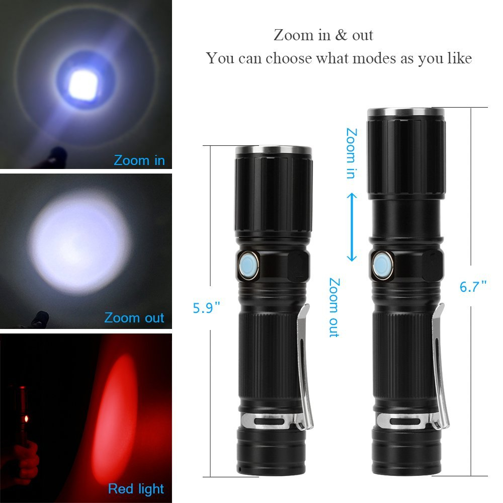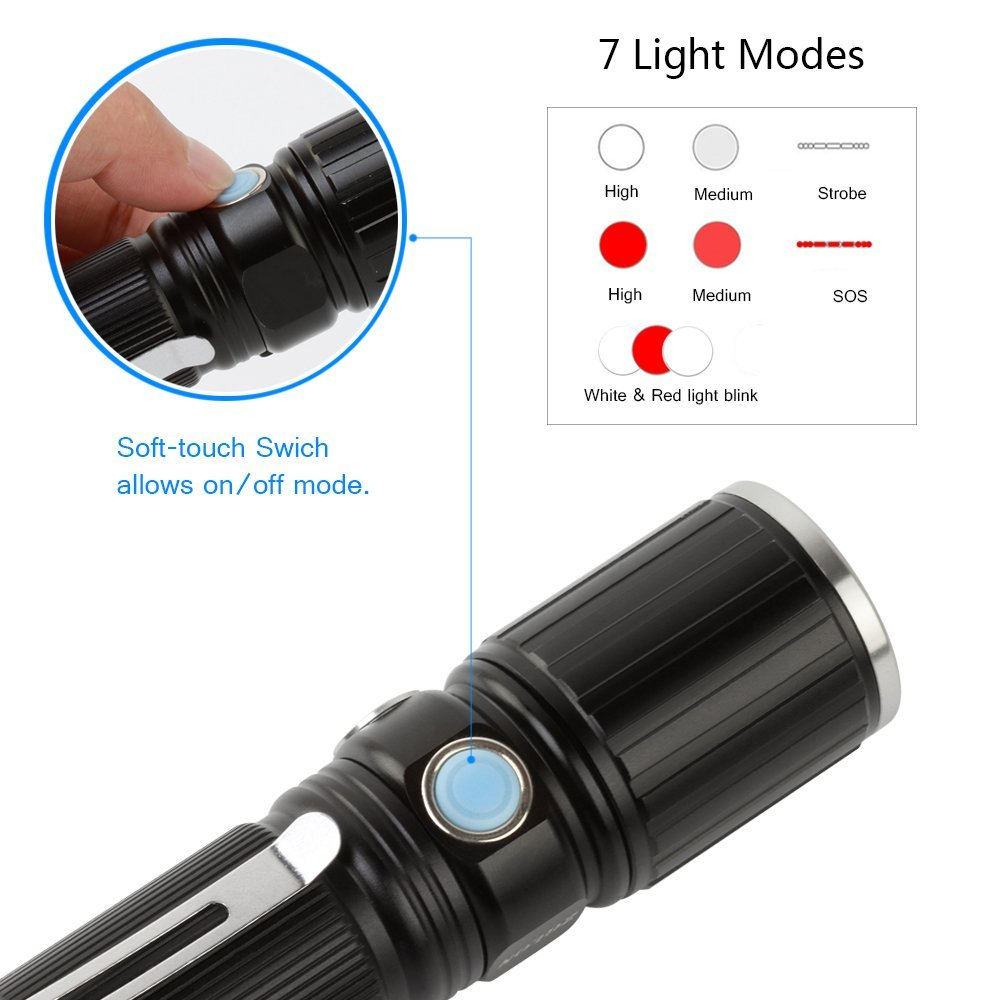 When using ultra bright zoomable tech waterproof flashlight, stretch the flashlight head to adjust the beam. Gently press the switch button, it will change a mode. 7 Light Modes: High/Medium/Strobe white brightness, High/Medium/SOS red brightness. Always Hold the switch button firmly, white light u0026amp; red light alternating