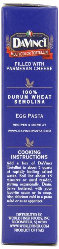 -. Binding : Grocery -. Brand : DaVinci -. EAN : 0070670008439 -. Feature : Case of 12 7-ounce boxes of tortellini (84 total ounces) / Air-dried tortellini made from durum wheat semolina, with spinach or tomato and with parmesan cheese filling / Contains only high-quality natural ingredients / Made with the time-honored process of air drying for a consistent al dente texture / Product of Italy -. Label : DaVinci -. Manufacturer : DaVinci -. Model : 070670008439 -. MPN : 078341-5 -. NumberOfItems : 1 -. PackageQuantity : 12 -. PartNumber : 078341-5 -. ProductGroup : Grocery -. ProductTypeName : GROCERY -. Publisher : DaVinci -. ReleaseDate : 2006-04-11 -. Studio : DaVinci -. Title : DaVinci Multicolor Tortellini, 7-Ounce Boxes (Pack of 12) -. UPC : 070670008439