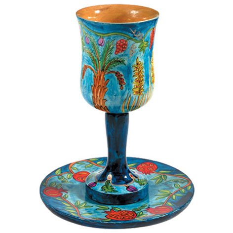 -. Title : Hand Painted Wood Kiddush Cup and Coaster / The Seven Species Design