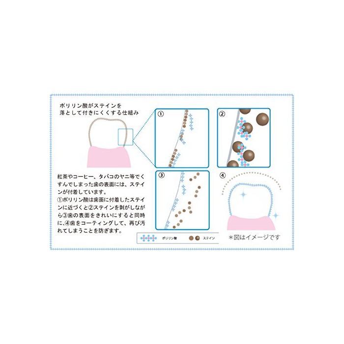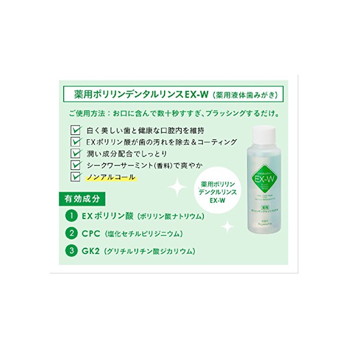 유효성분인 EX폴리 인산(폴리 인산 나트륨)고, CPC(염화《세치루피리지니우무》)고, GK2(글리시리진산 더 칼륨)를 배합하고, 치아의 표면의 얼룩을 제거해 한층 더 코팅 하는 것으로,본래가 희게 아름다운 이와 건강인 구강내를 유지한다“약용 폴리 ring 덴탈 린스EX-W(약용 액체《하미가키》)