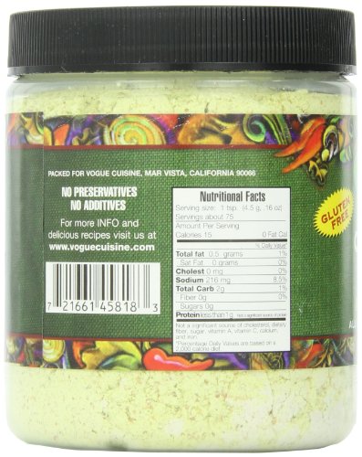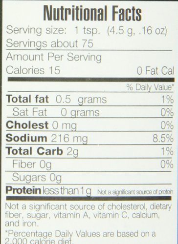 - 12oz jar = 75 Servings, 15 Calories per cup (Sodium Content per serving: 216mg)