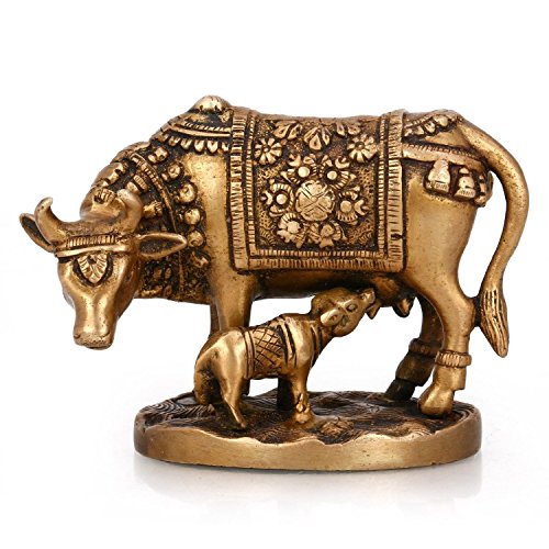 Exotic India Cow with Calf Brass Statue, 5.2" x 2.3" x 4"