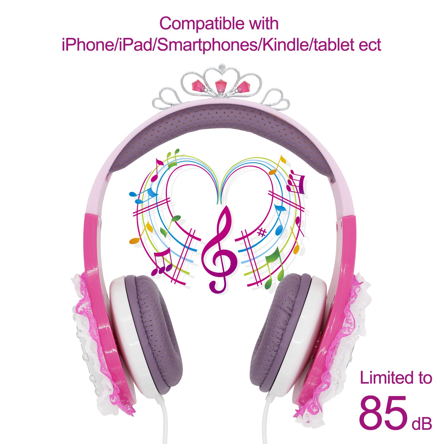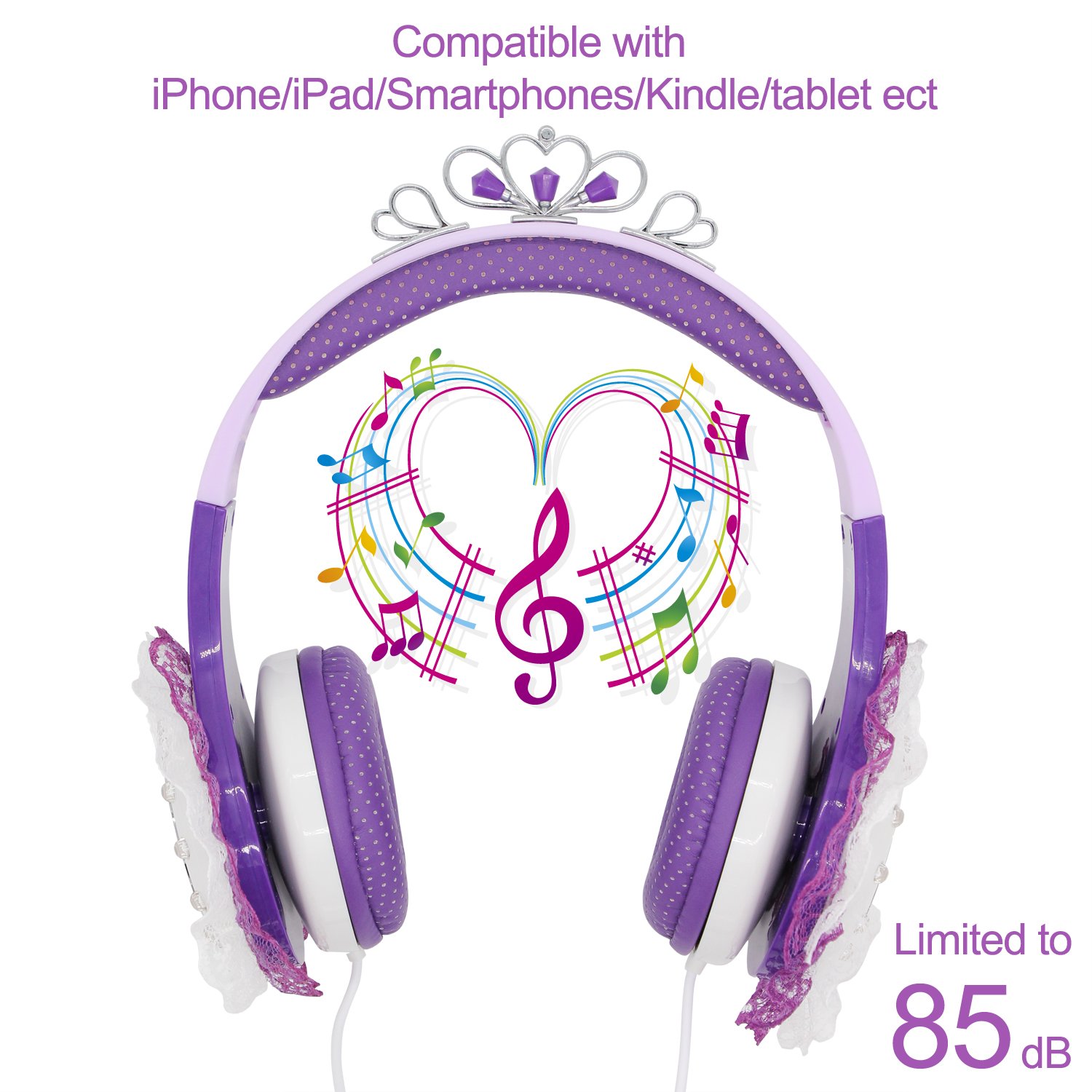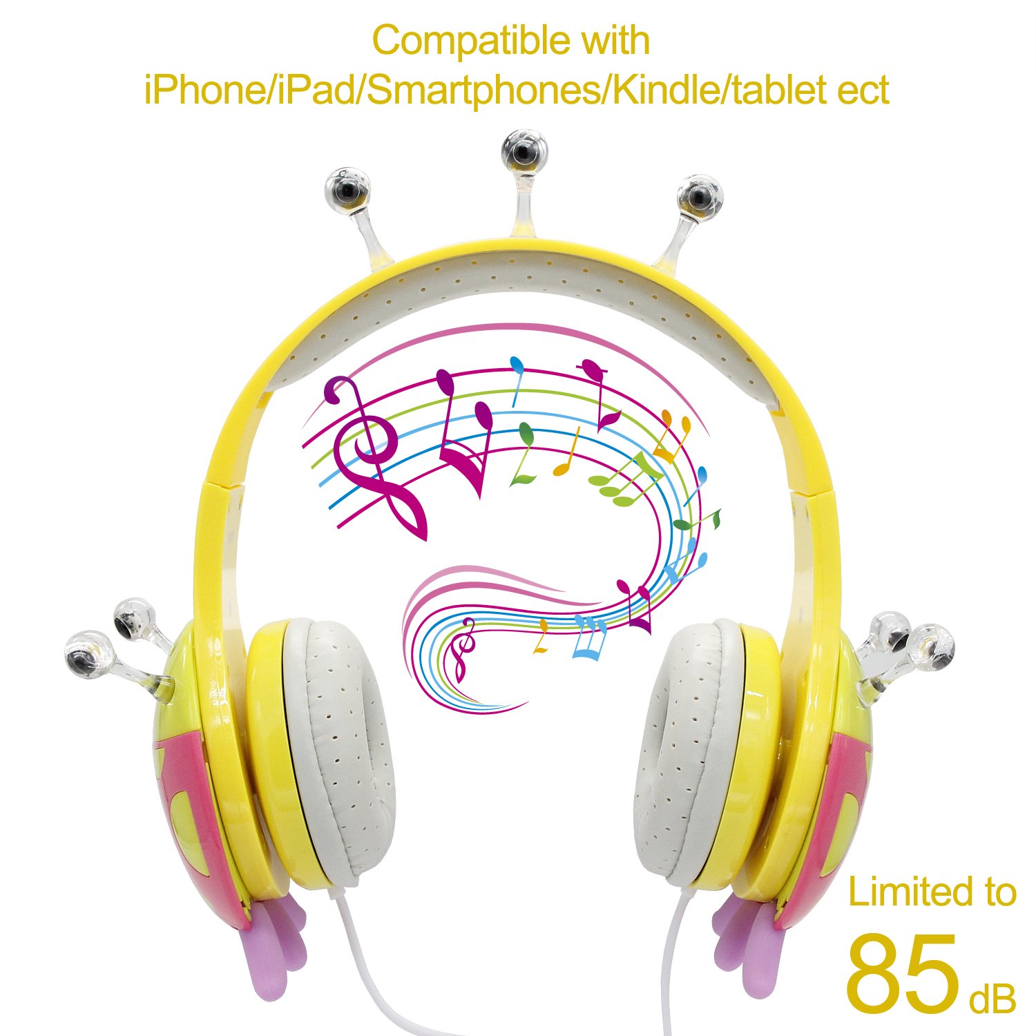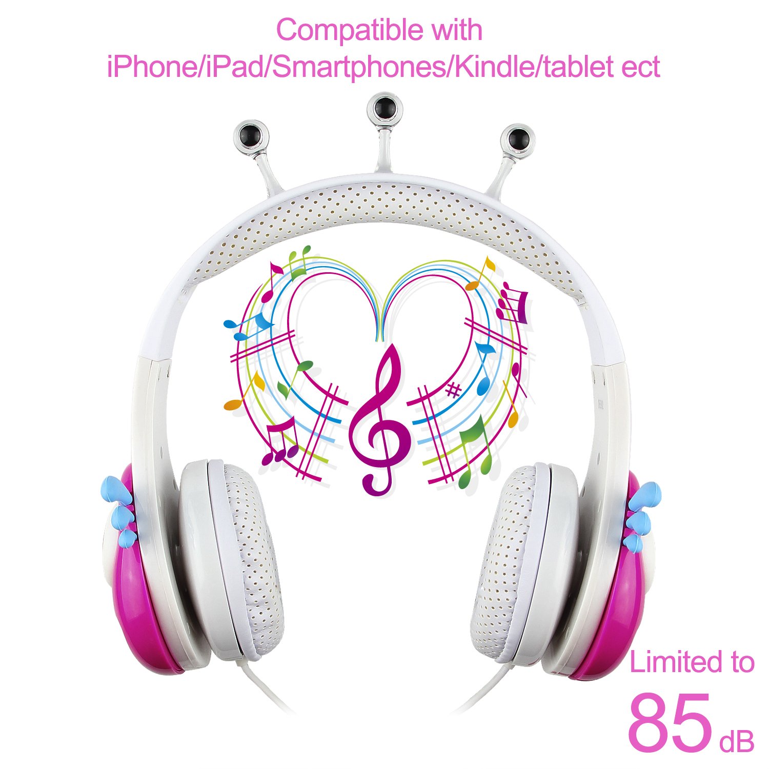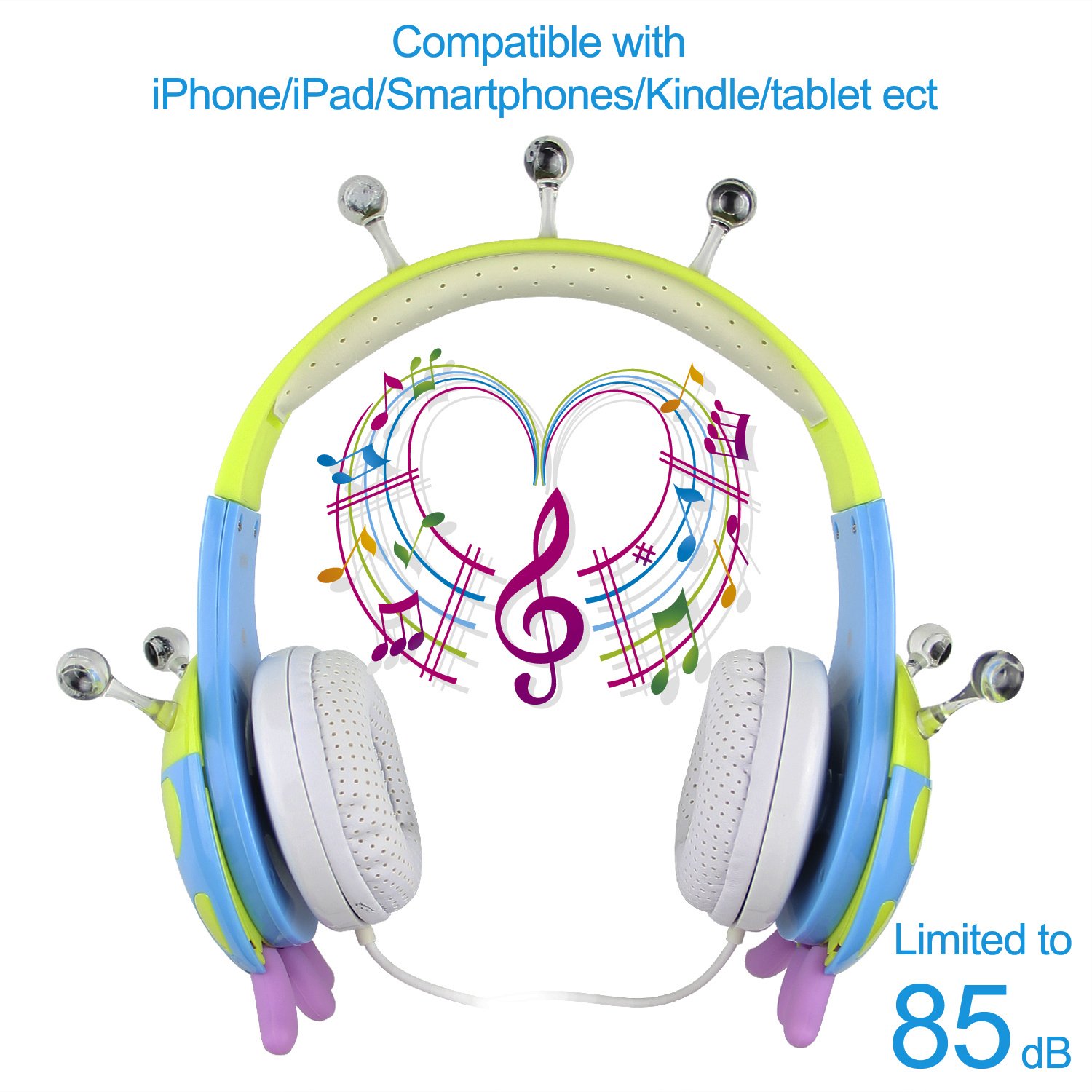 Driver Unit:30mm Impedance:32Ω Sensitivity: 85±3dB Frequency Response: 20Hz-20000Hz Max Input Power:30mW Cable: 1.5m/ 4.92 feet Plug Type: 3.5mm Volume Control : 85dB Headband: Adjustable to fit growing kids and teens