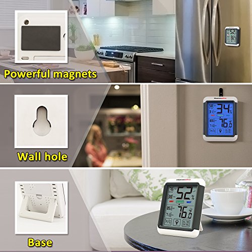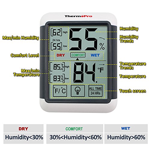 Equipped with professional grade sensors, the ThermoPro TP-55 provides most accurate measurements, be it for humidity or temperature, allowing you to be aware if adjustments are necessary for your household. The TP55 is not just highly accurate but extremely user friendly with a backlight for those nighttime last minute checks on current readings before bed. That's not all, no longer will it be necessary to unmount the device off your wall or fridge to switch settings, simply use the touchscreen display. Furthermore, it provides an abundance of valuable information, such as displaying 24 hour/all-time high/low records and current trends for both humidity and temperature and humidity level icons that indicate if your home is too humid, too dry or just right!