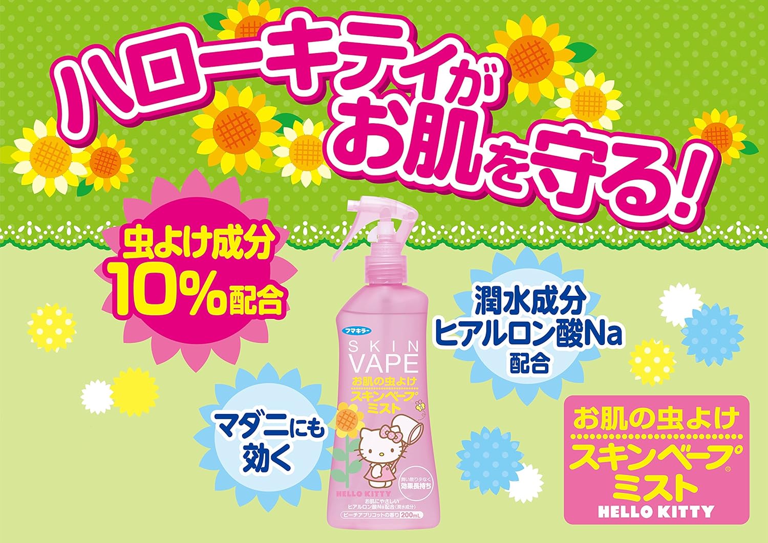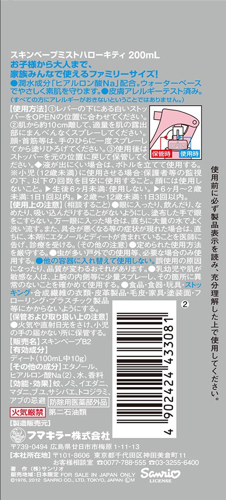 原産国 : 日本内容量 : 200mL商品サイズ (幅X奥行X高さ) : 73×37×220商品紹介虫よけ成分を10%配合、効きめ長持ち。保湿成分ヒアルロン酸Naを配合。舞い散りが少なく使いやすい。イヤナニオイをおさえた処方。ピーチアプリコットの香りです。お肌にしっとりなじむウォーターベースの心地よい使用感。