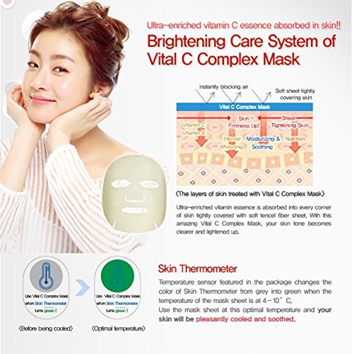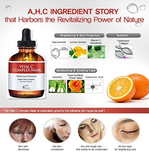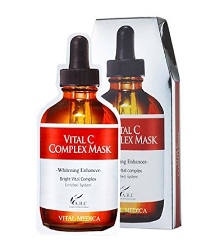 -. Feature : ▶ AHC Vital C Complex Mask x 5 pcs / ▶ The Vitamin C and whitening ingredients really help to brighten the skin to make it look more radiant and clear. / ▶ It protects the skin from the harsh environment for a more healthy and glowing looking skin. / ▶ It also soothes and moisturizes the skin by penetrating deep into the skin. / ▶ The major ingredients in this mask are Lemon Extract 50%, Sodium Hyaluronate, Rose Extract, Allantoin, and Collagen.