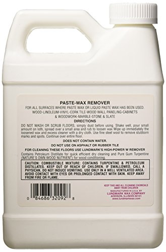 Studio : Lundmark Wax Publisher : Lundmark Wax Binding : Kitchen Product Description Paste wax remover (for paste wax floors) 6 x 32 oz. For removing paste wax or liquid paste wax from all surfaces such as wood floors, linoleum, vinyl, cork, tile, wood wall paneling, woodwork, cabinets, appliances, marble, stone, slate, Terrazzo and furniture . Do not use on Asphalt or rubber tile . Does not contain water or wax . 0