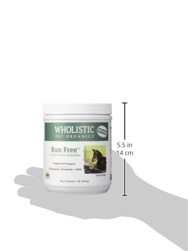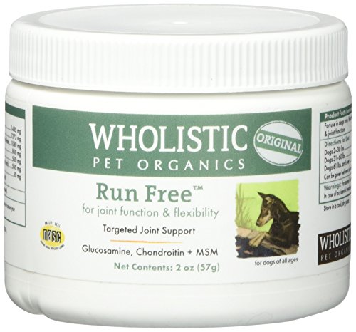 Wholistic Pet Run Free is an organic blend of ingredients combining together to repair, strengthen and prevent damage to cartilage. Rich in EPA and DHA, natural anti-inflammatories and antioxidants including Ester C, Wholistic Pet Run Free contributes to unparalleled support for joint health. Contains only pharmaceutical, USP-standardized, human grade nutraceuticals that attest to its purity, strength and maximum effectiveness. Run Free is a powerful, effective natural joint formula to provide your dog with long lasting relief and provide the most comprehensive line of defense against joint injuries and arthritis. And Wholistic Pet Run Free is very cost effective. One 8oz container will last a medium sized dog approximately 6 months!Feature